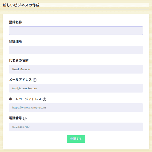 申請ボタンをクリックすると仮登録となり、ビジネスアカウントのメインページに誘導されます。本人確認のために、登記証明書等、ビジネス情報を確認できる書類の画像をアップロードしてください。個人事業の場合は、免許証のコピー等をアップロードしてください。書類提出について、不明な点等がありましたらお問合せください。
